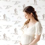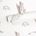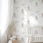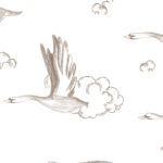 Papel Pintado con ilustraciones de gansos y nubes en tono beige sobre fondo blanco. Es ideal para crear un ambiente neutro y calmado.