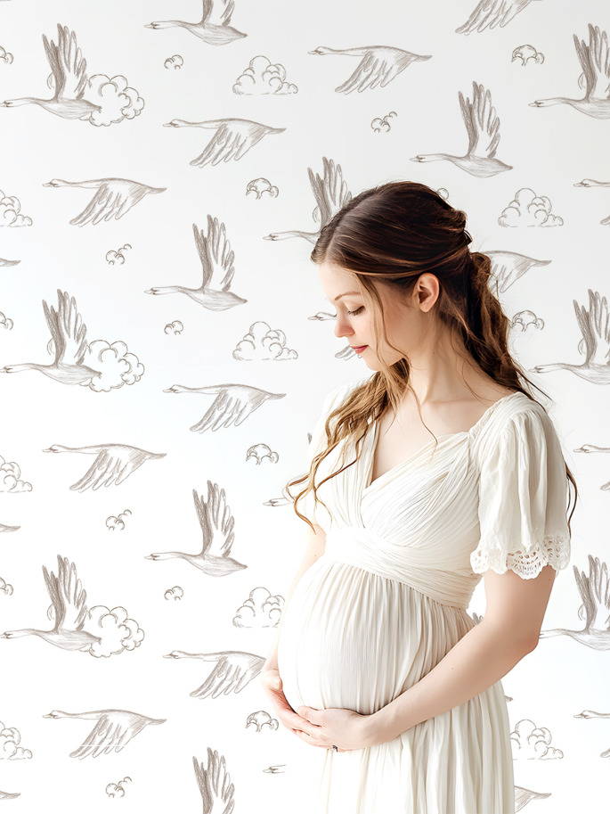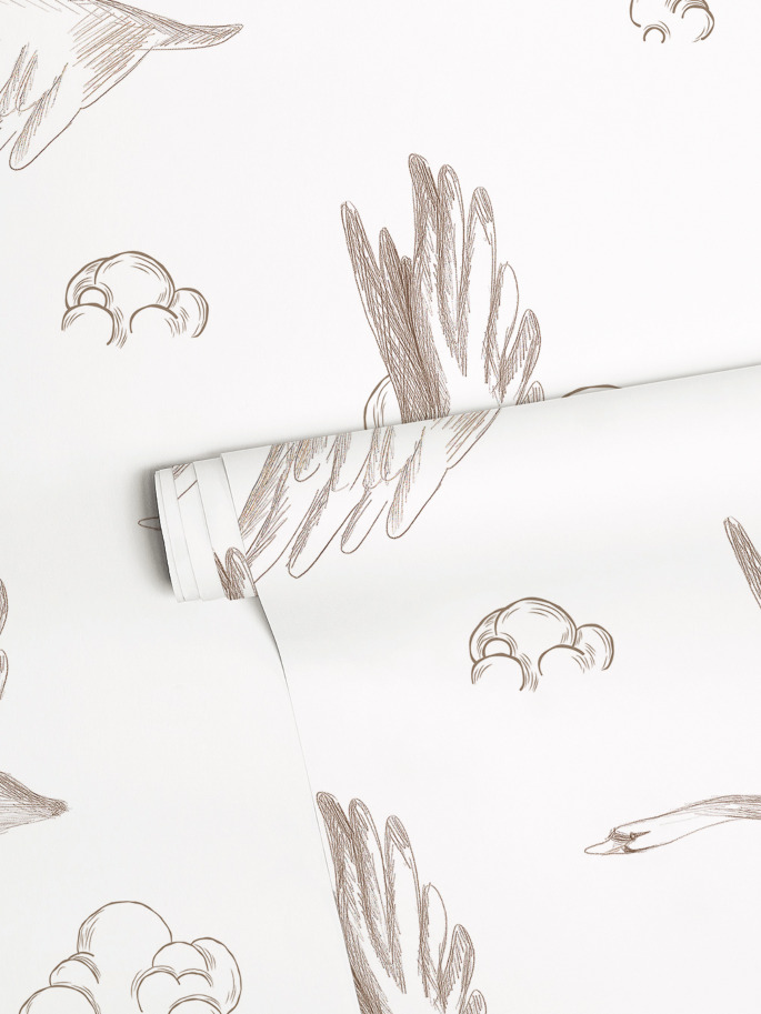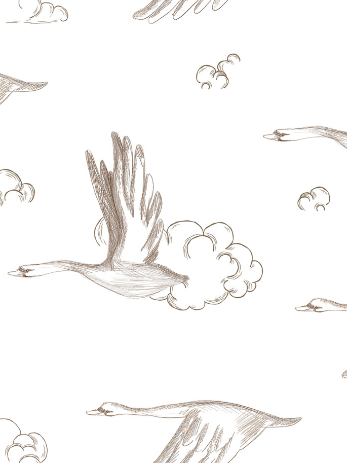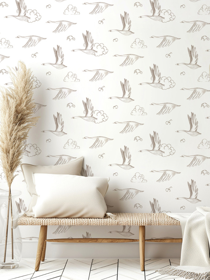 Papel Pintado con ilustraciones de gansos y nubes en tono beige sobre fondo blanco. Es ideal para crear un ambiente neutro y calmado.