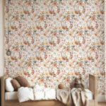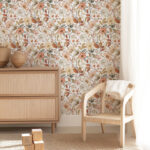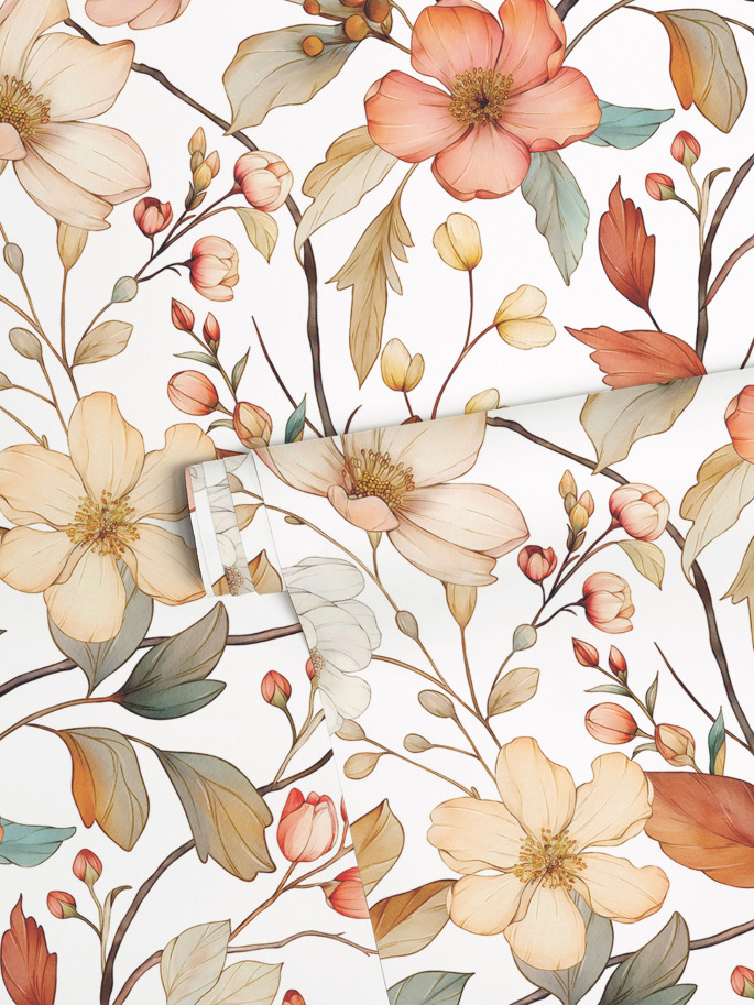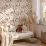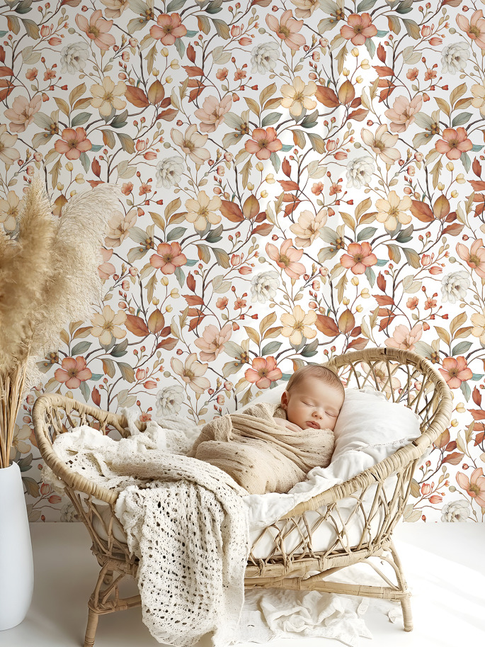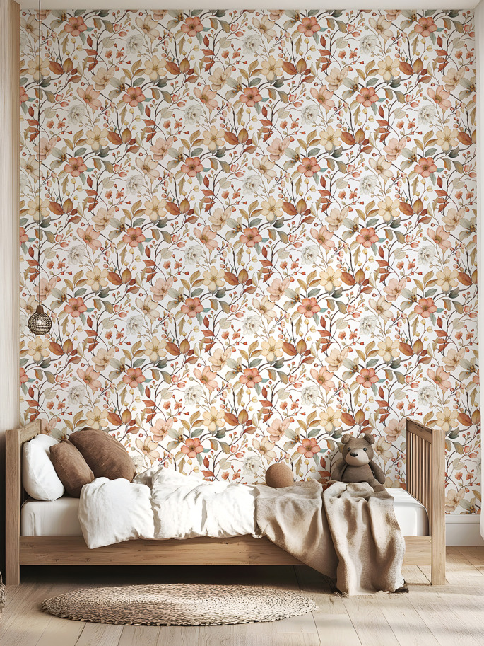 Papel pintado infantil con preciosos motivos de ramas y flores en tonos empolvados que coordinan perfectamente entre si, para crear un ambiente cálido y elegante.