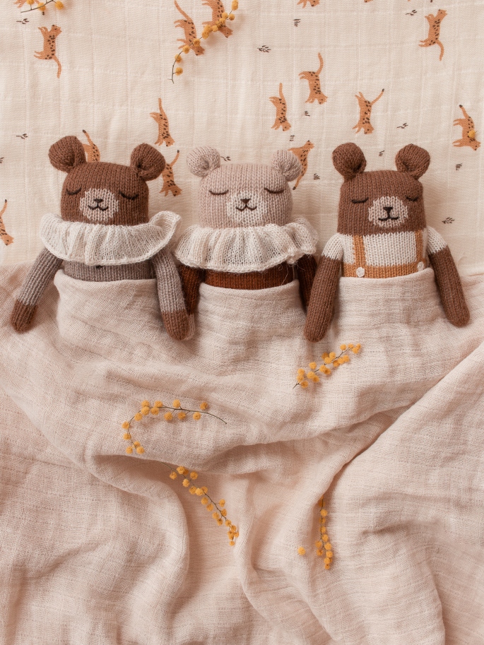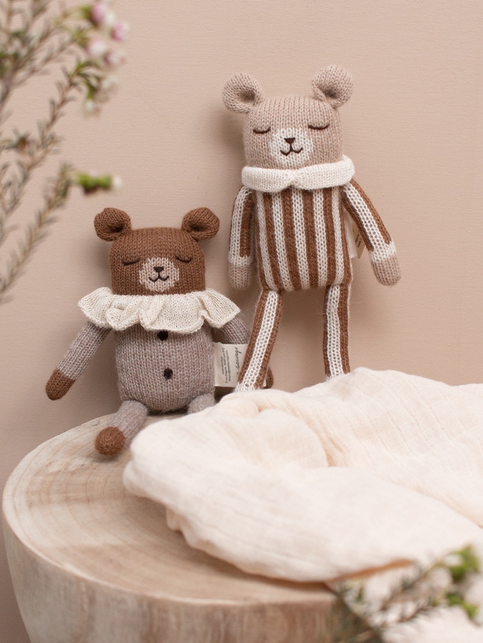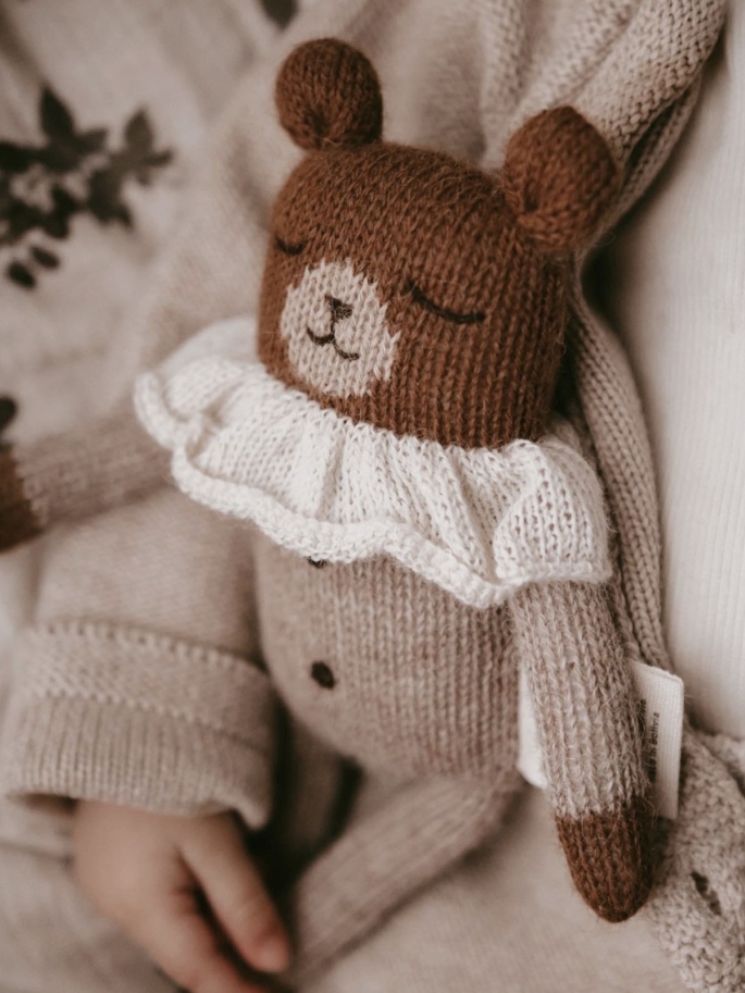 El osito Nico, es el compañero perfecto para el bebé. Está tejido y bordado a mano con gran esmero, en un taller de comercio justo.