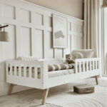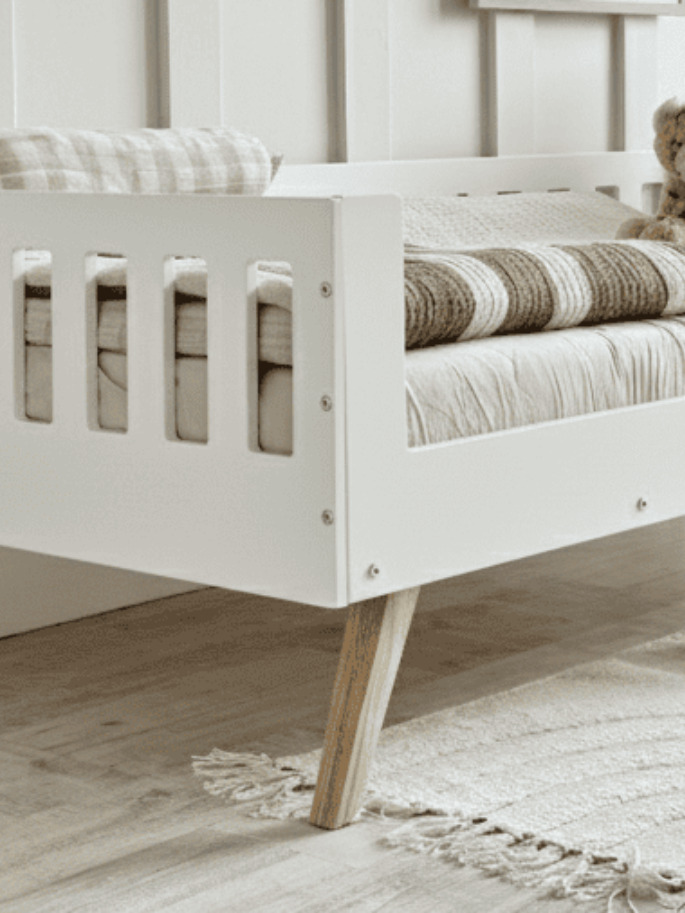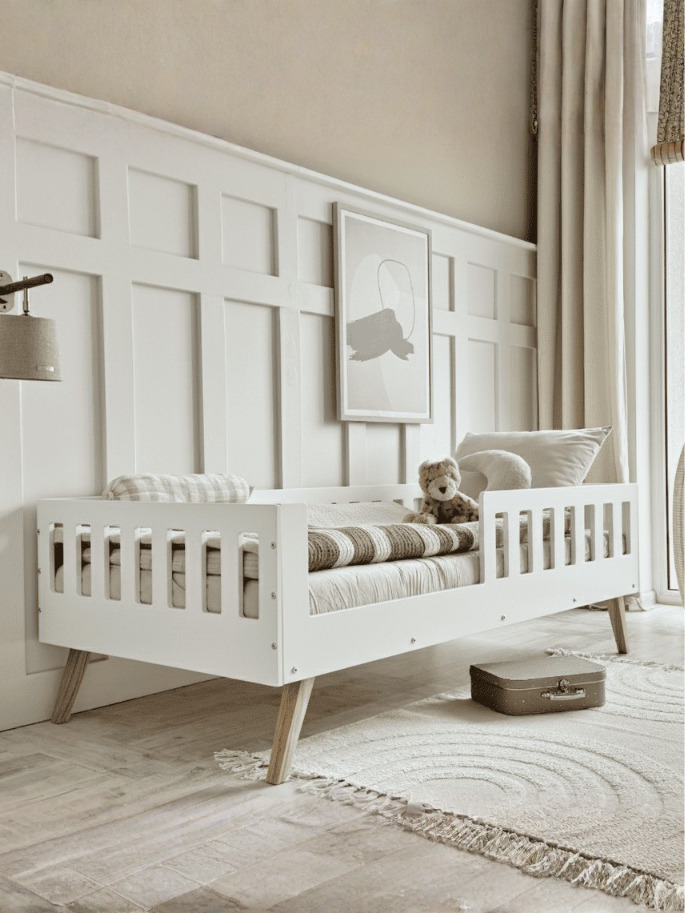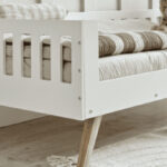 La cama está hecha de madera contrachapada de primera calidad, con acabado de pintura ecológica al agua libre de tóxicos, en color blanco.