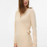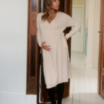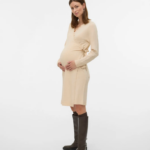 Vestido premamá de punto crudo, con escote cruzado y lazada