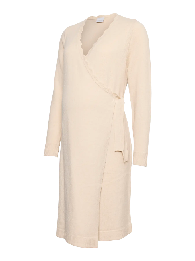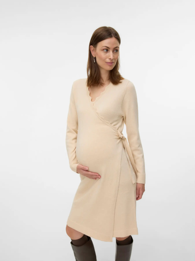 Vestido premamá de punto crudo, con escote cruzado y lazada