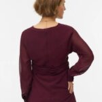 Tejido ligero de gasa. Escote en V. Mangas con volumen y puño con cierre de botones.