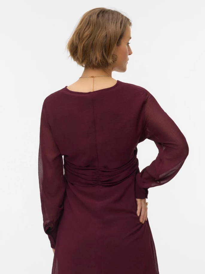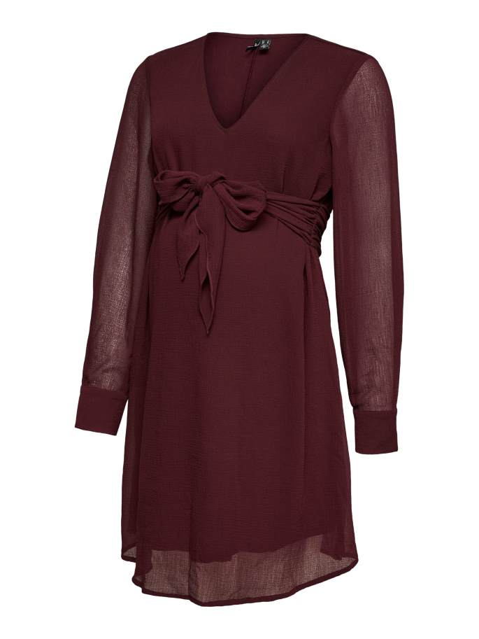 Elegante vestido premamá de gasa, con mangas semi transparentes y detalle de lazada. Perfecto para una cena o cualquier ocasión especial.