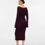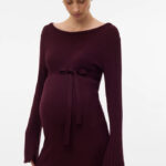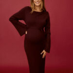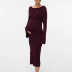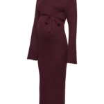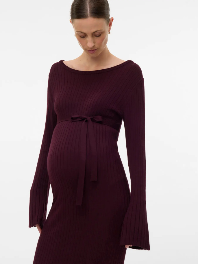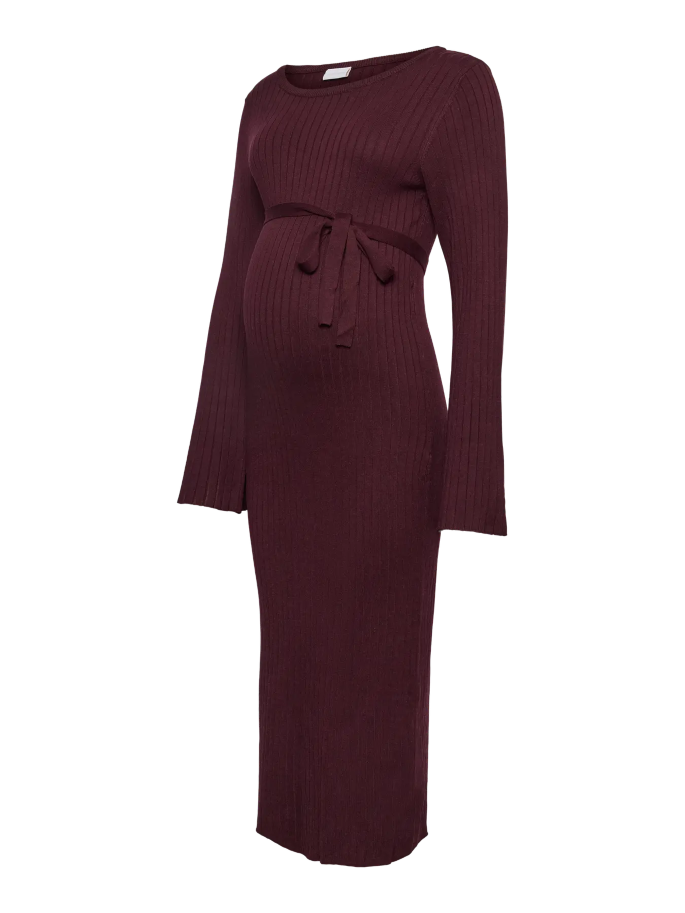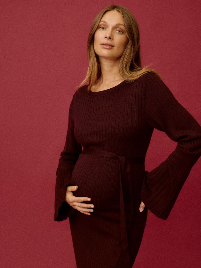 Vestido midi premamá de punto acanalado, con cuello barco y mangas acampanadas, en un bonito tono burdeos.